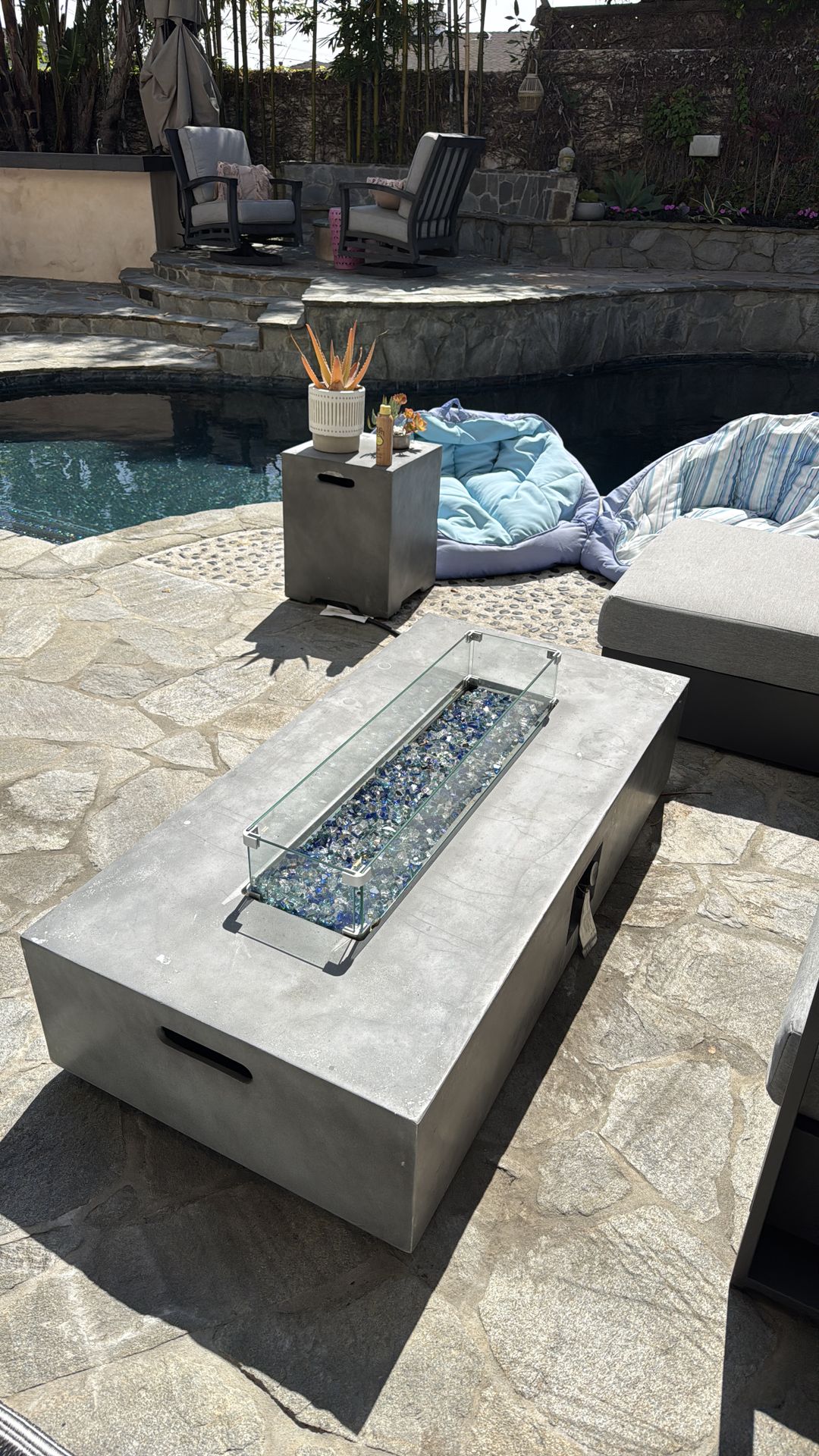 Gas propane firepit. Bought for $800, has some hit or miss issues with igniting, that’s why price is so low. 56” long. Added glass to elevate the look. Comes with end table to hide propain