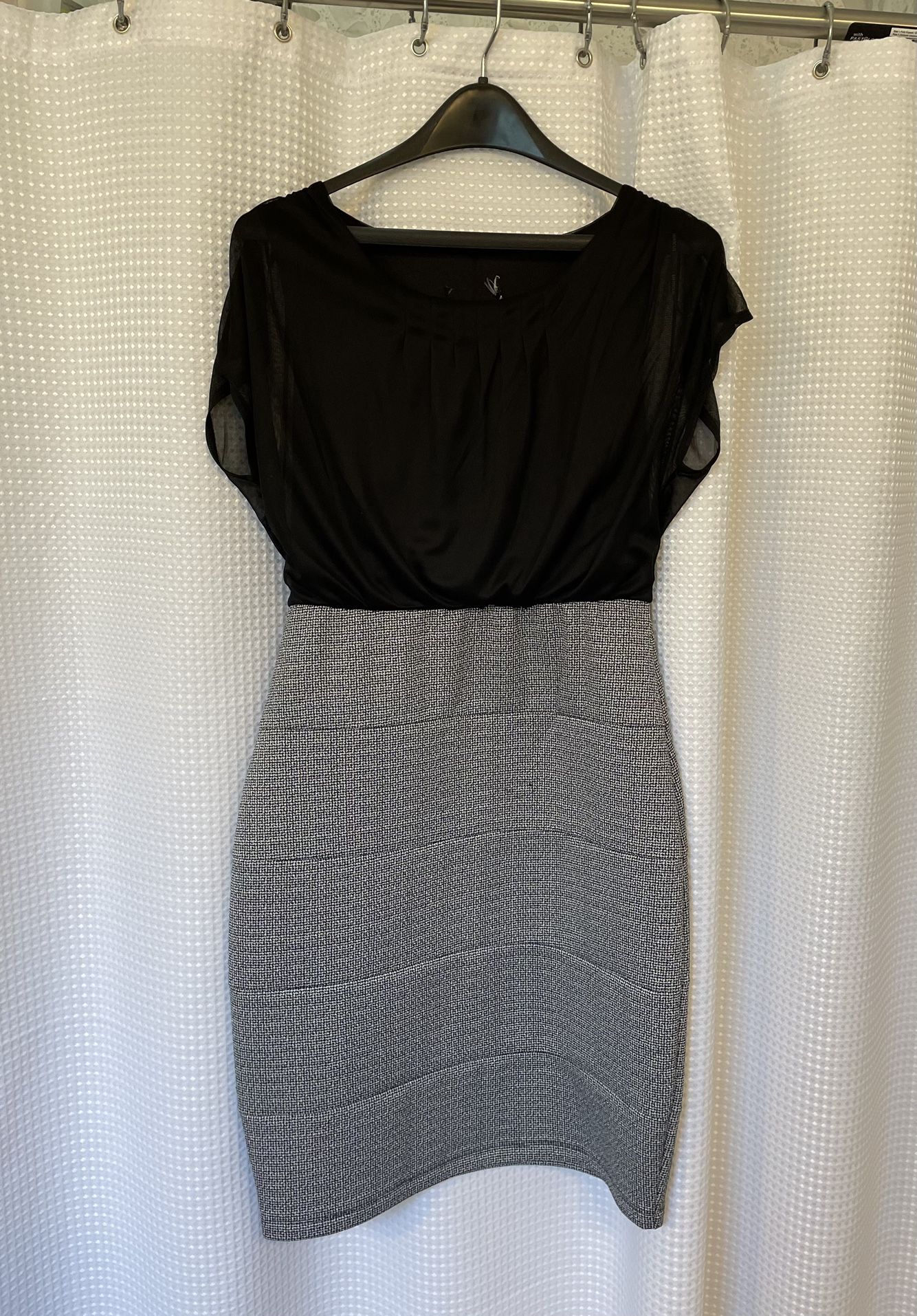 This stylish dress has an all black top half and black and white patterned bottom half. Brand is En Focus women’s size 10