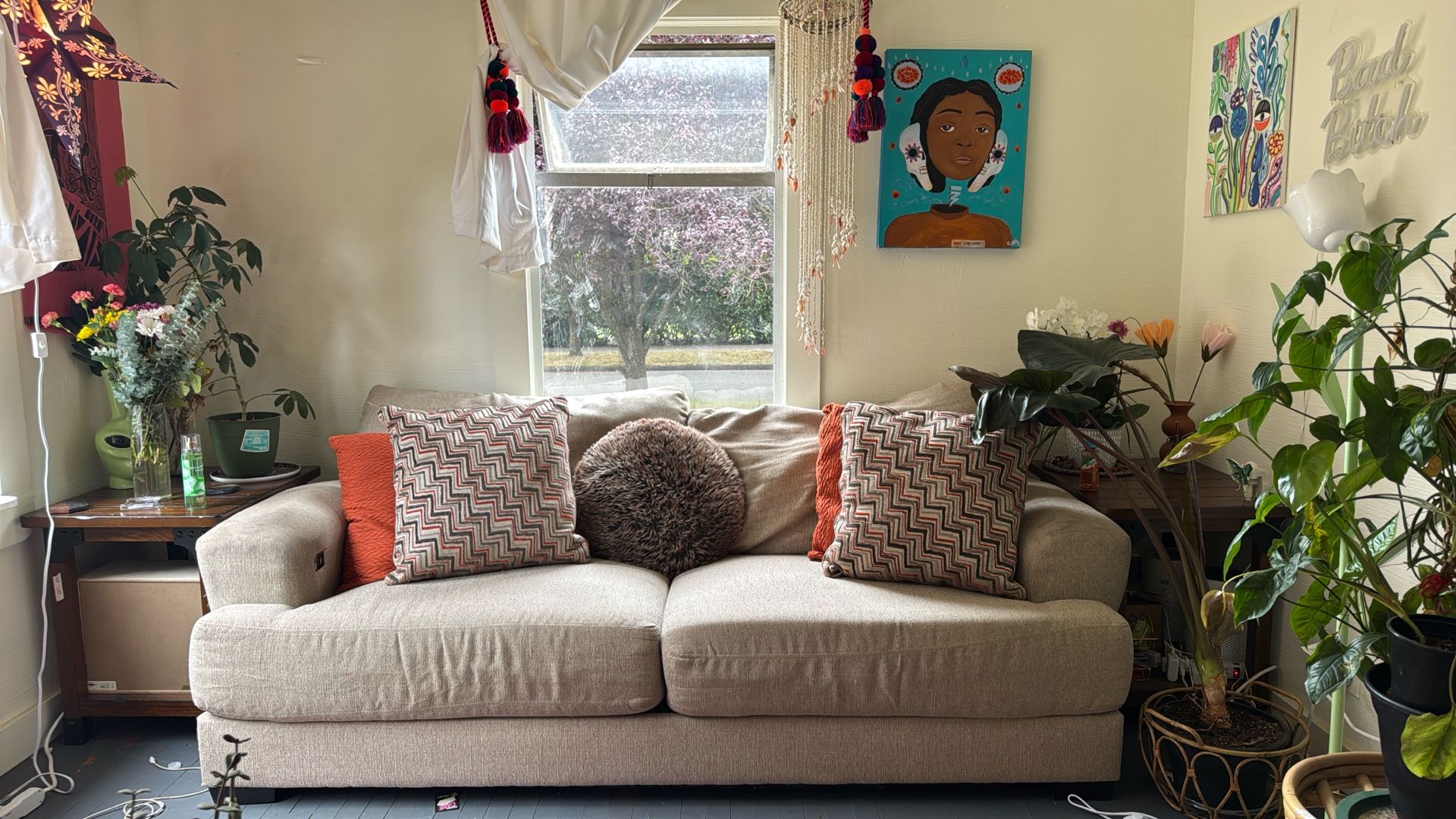 Gently used two year-old sofa that has USB charging ports on both sides. Comes with two matching end tables.
