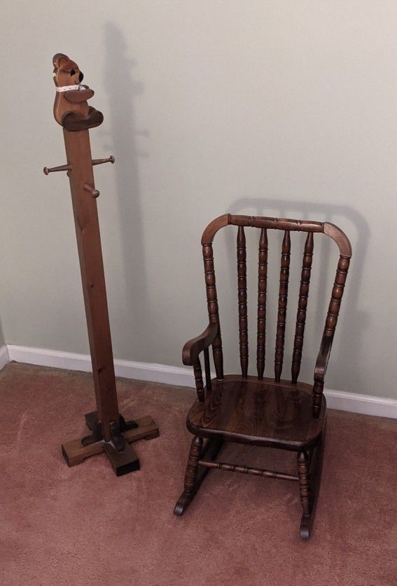 Cute wooden rocking chair and bear top clothes stand. Made of wood. Brown stained color.