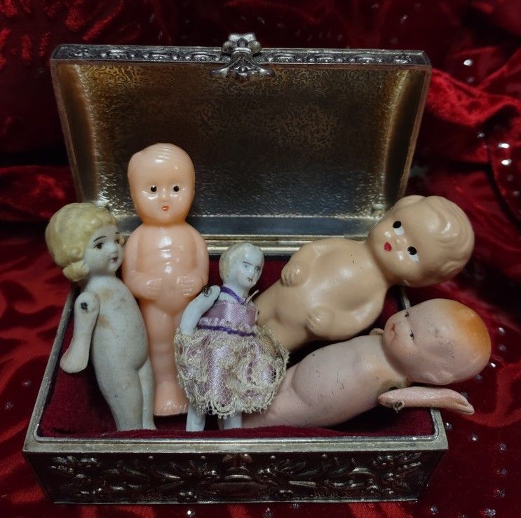 This is a Metal Box of Antique/Vintage Bisque Dolls. (As is) See pics***STRICTLY CASH ONLY***PUBLIC C MEET UP