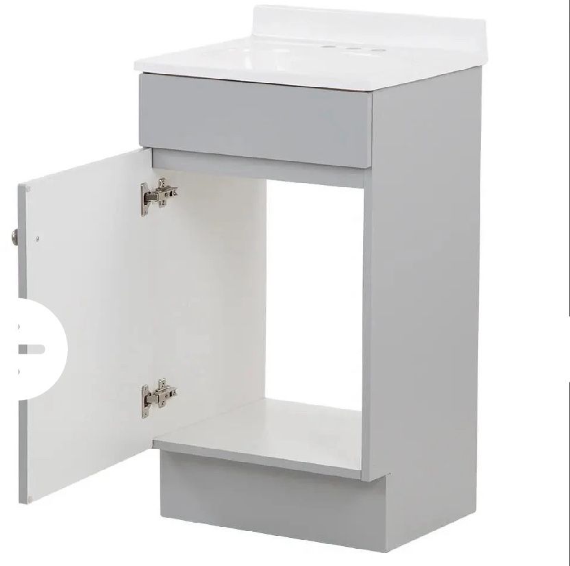 Size:- L 18” X W 16” X H 32” With Sink. $139 Project Source 18-in Gray Single Sink... Description Bathroom Vanity with White Cultured Marble Top. Condition: Excellent Damaged?: No In Packaging?: Yes Assembly Required?: No Missing Parts?: No Functional?: Yes UPC: (contact info removed)16 Brand: Project Source Model: R39 VBCU1816 Title: $139 Project Source 18-in Gray Single Sink Bathroom Vanity with White Cultured Marble Top Maximize your storage space with this bathroom vanity with top. A trend-forward Shaker gray finish with brushed nickel hardware and a cultured marble top, complements a variety of color palettes. One Shaker cabinet door allows you to store cleaning supplies, toiletries or towels out of sight. This beautiful vanity, at a friendly price-point, will suit many design styles. At 18.6-in W and 16.6-in D, this fully assembled vanity brings style and storage to your bath.