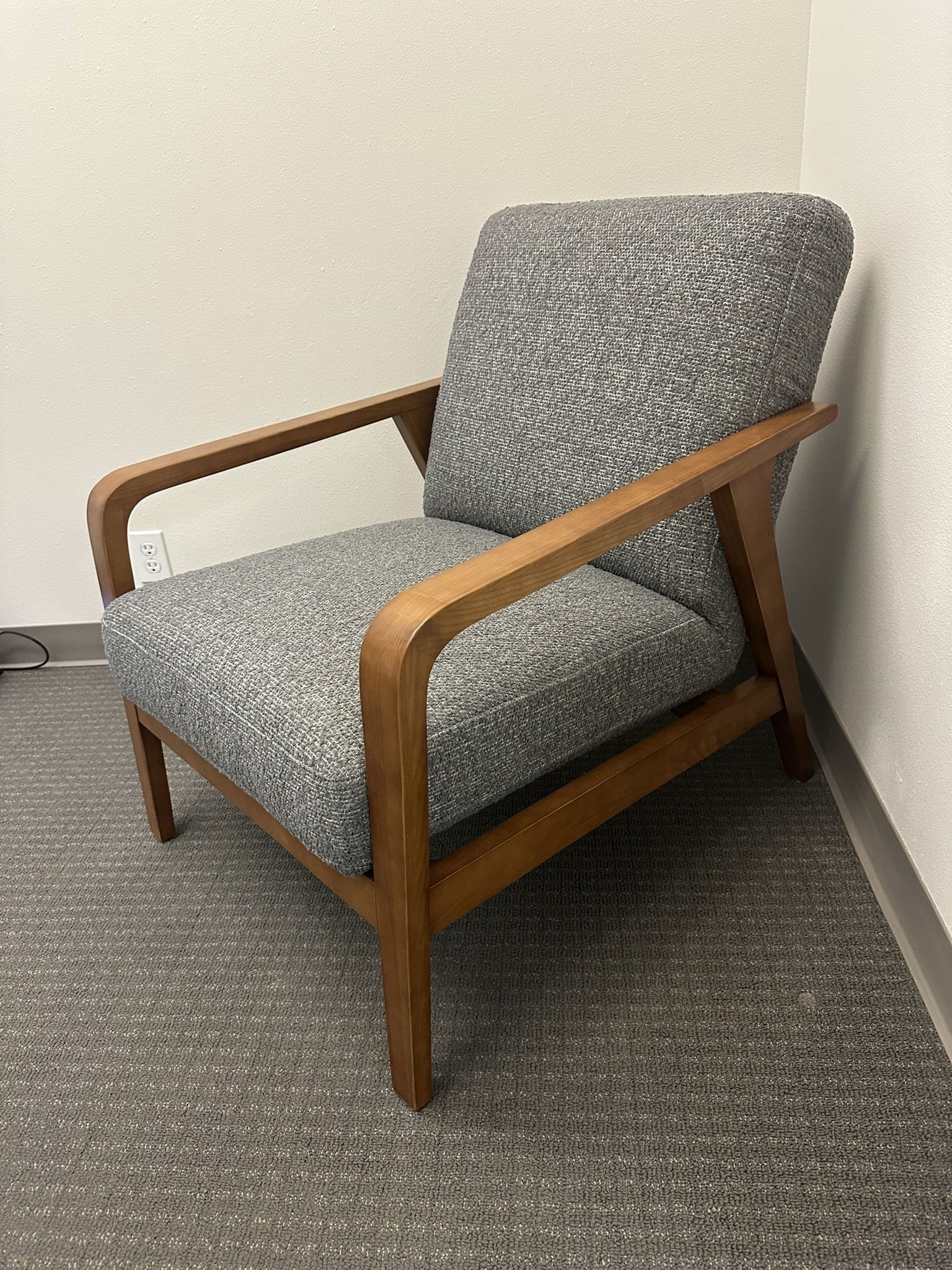 Upholstered chair with wood finish arms from Kasala. In excellent condition from non-smoking home, pet free home. Moving and can’t take with us.