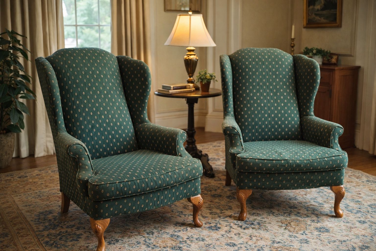 Matching Wingback Armchairs – Classic Traditional Style, Green Upholstery, Solid Wood Legs