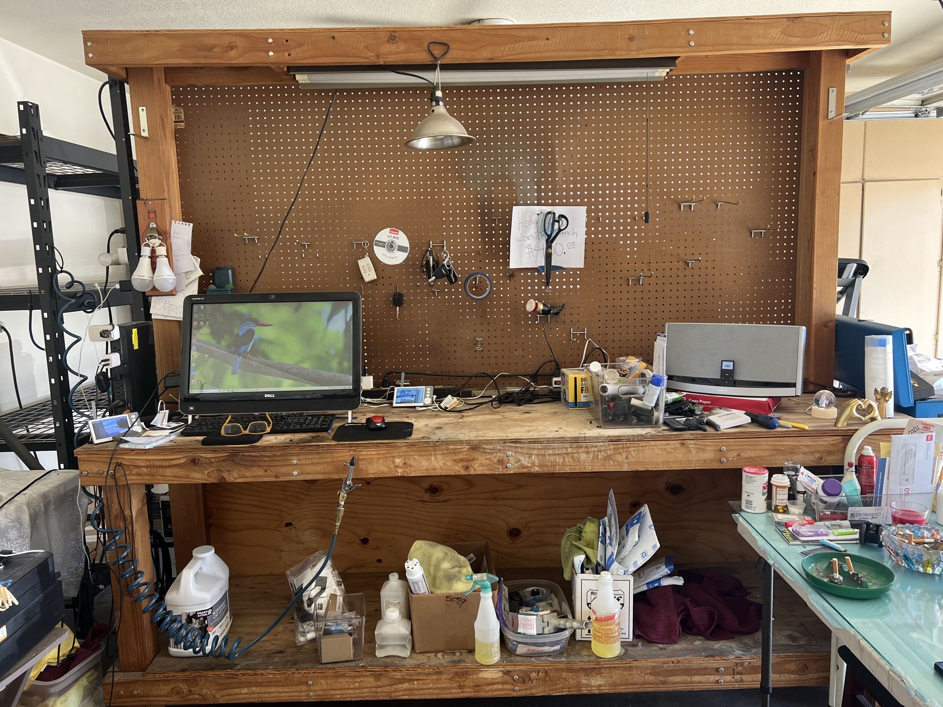 Custom made Wood work/tool bench with peg board & hooks. Heavy duty bench, built in light, built in diamond plated outlet, built in beer opener, metal surround sound speaker holder, & air compressor hose hooks. The hooks on the pegboard are completely adjustable to customize your own personal tools & look. In the process of downsizing and moving so it needs a good wipe down. No delivery. $300 8’W x 7’H x 2’D