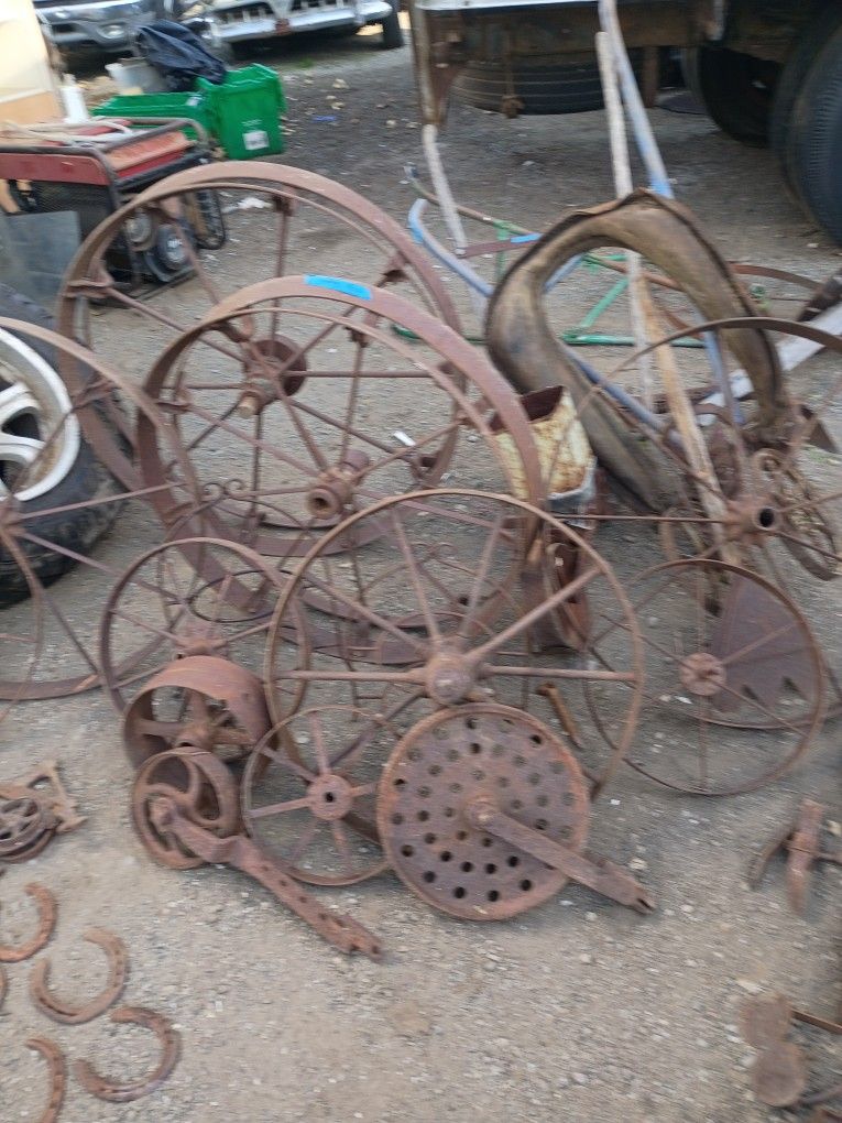 Antique tractor wheels, plows and various antique farm stuff great for landscaping projects from$20 to $200 or$1000 takes all!