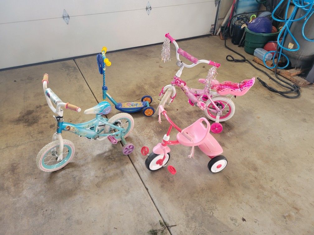 Bikes - $25 Tricycle - $10 Scooter- $5 All my daughters old stuff that she no longer needs or wants. Good condition