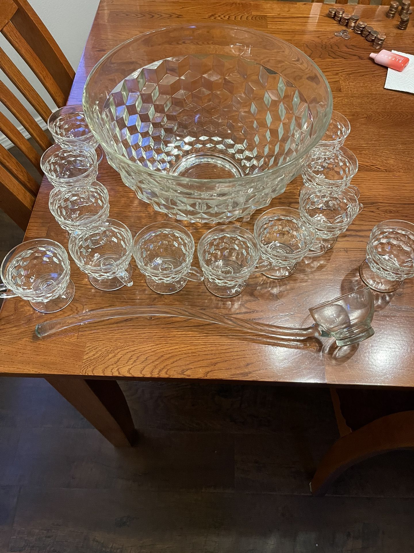 All glass even the serving cup is glass. 12 glass cups, Design is diamonds or rolling blocks