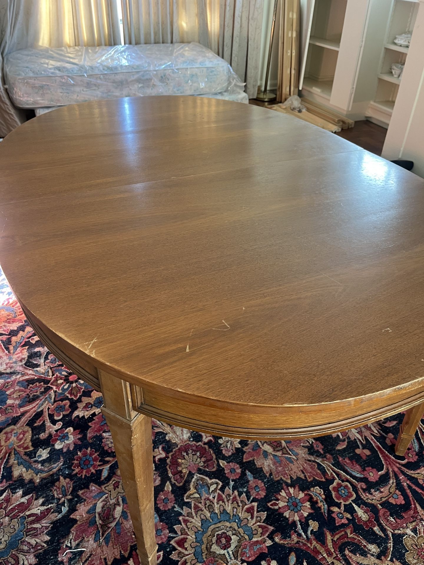 Drexel Triune Mahogany Dining Table - - 64" x 44" Perfect project for a woodworker and/or flipper This mahogany table is in very good condition. Comes with a full set of table pads, too. It is missing the brackets underneath, however, so needs to be repaired so can hold the leaves in place, A woodworker could easily fix this so it's greatly discounted. 3 leaves that are 12" wide. So table extends to 100" . You can buy the brackets online. Intact tables go for $1000 on the secondary market. This is a great deal for someone who is handy and wants to flip it or use it. CASH only Easy pickup in San Francisco - legs are removable. Please send your phone # if interested. Thanks.