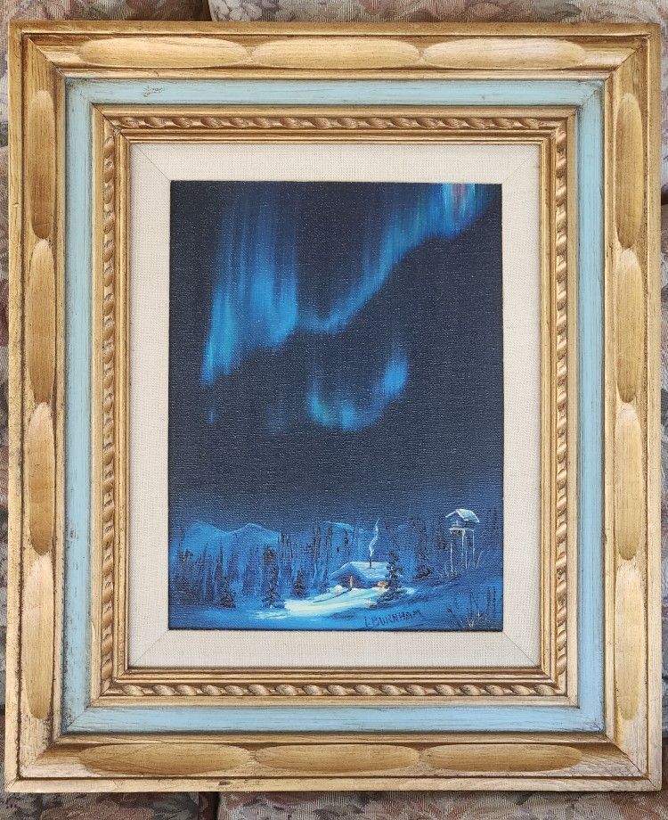Painting is in excellent condition. It is of a cabin in the woods with the Northern Lights. It is signed I Burnham(Irene Burnham) a listed American artist. Painting is in a custom 16-1/3 X 19-1/2 inch frame.