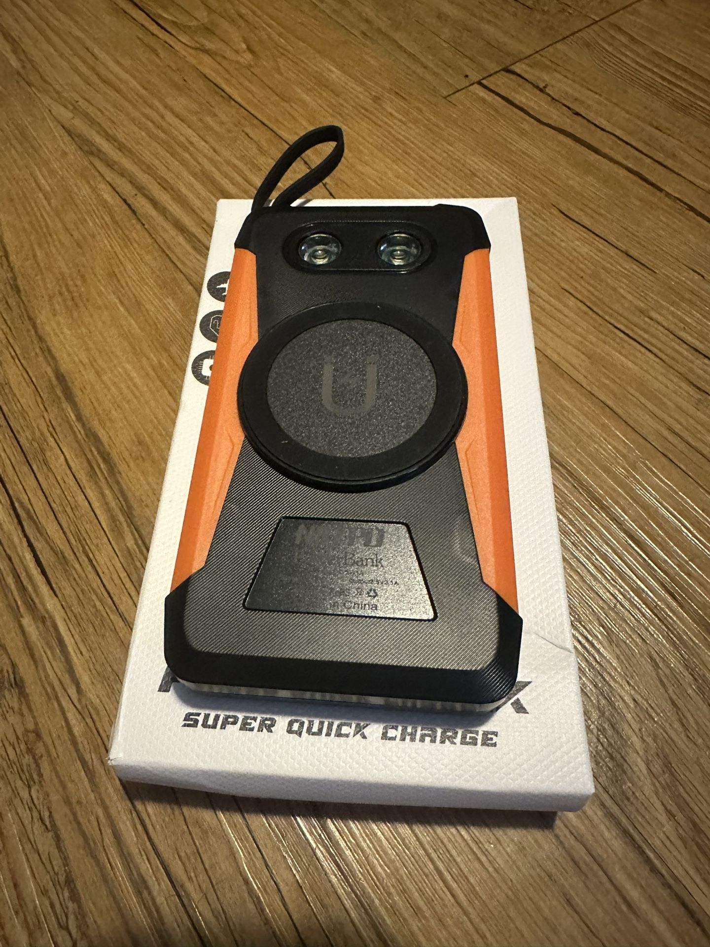 Brand new 30000mah solar magnetic power bank with integrated cables orange/black with lights.