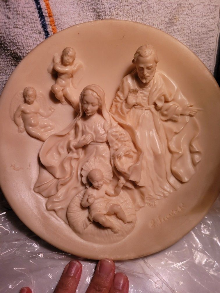 Collectible Alabaster Plate Studio DANTE di Volteradici " Joy To The World " 3d Nativity Scene. Ivory colored alabaster. Crafted in Italy.