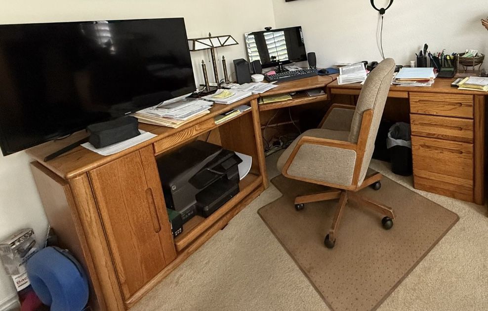 Four Pieces Solid Oak Office Desk / Computer / Printer Space Organizer With Drawers & Filing Cabinet Including Office Chair Only Cash
