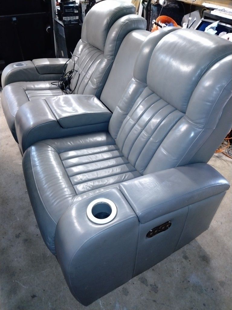 Leather Power Loveseat, Recliner, Gray Leather, Very Good Condition