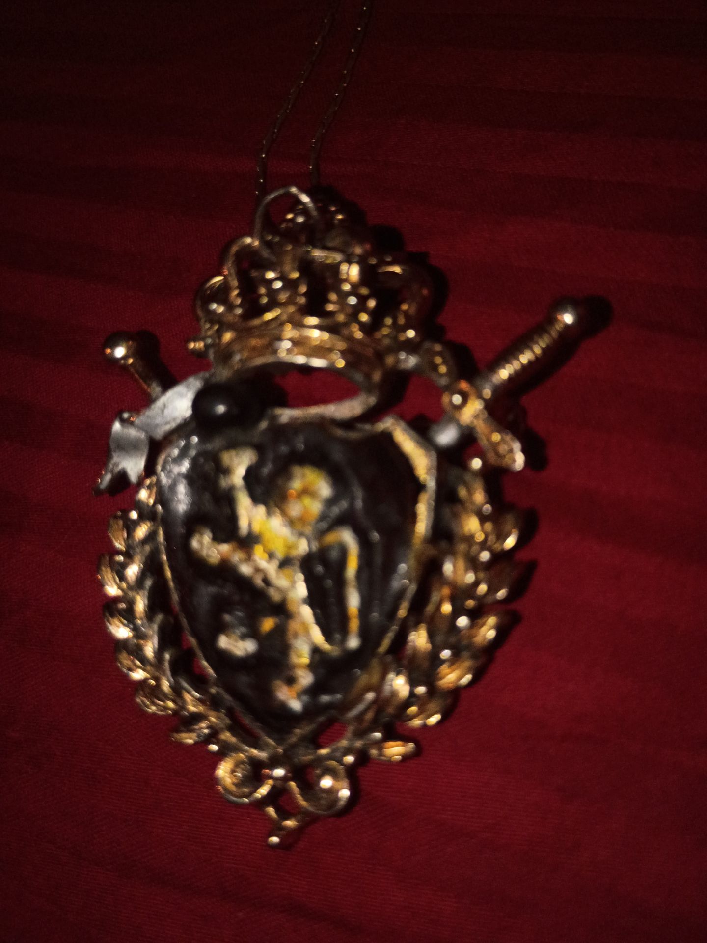 Lion playing with ball framed by two different swords,ribbon, leaf wreath. Gold toned and black ename. Could be worn as pendant on necklace or brooch pin.