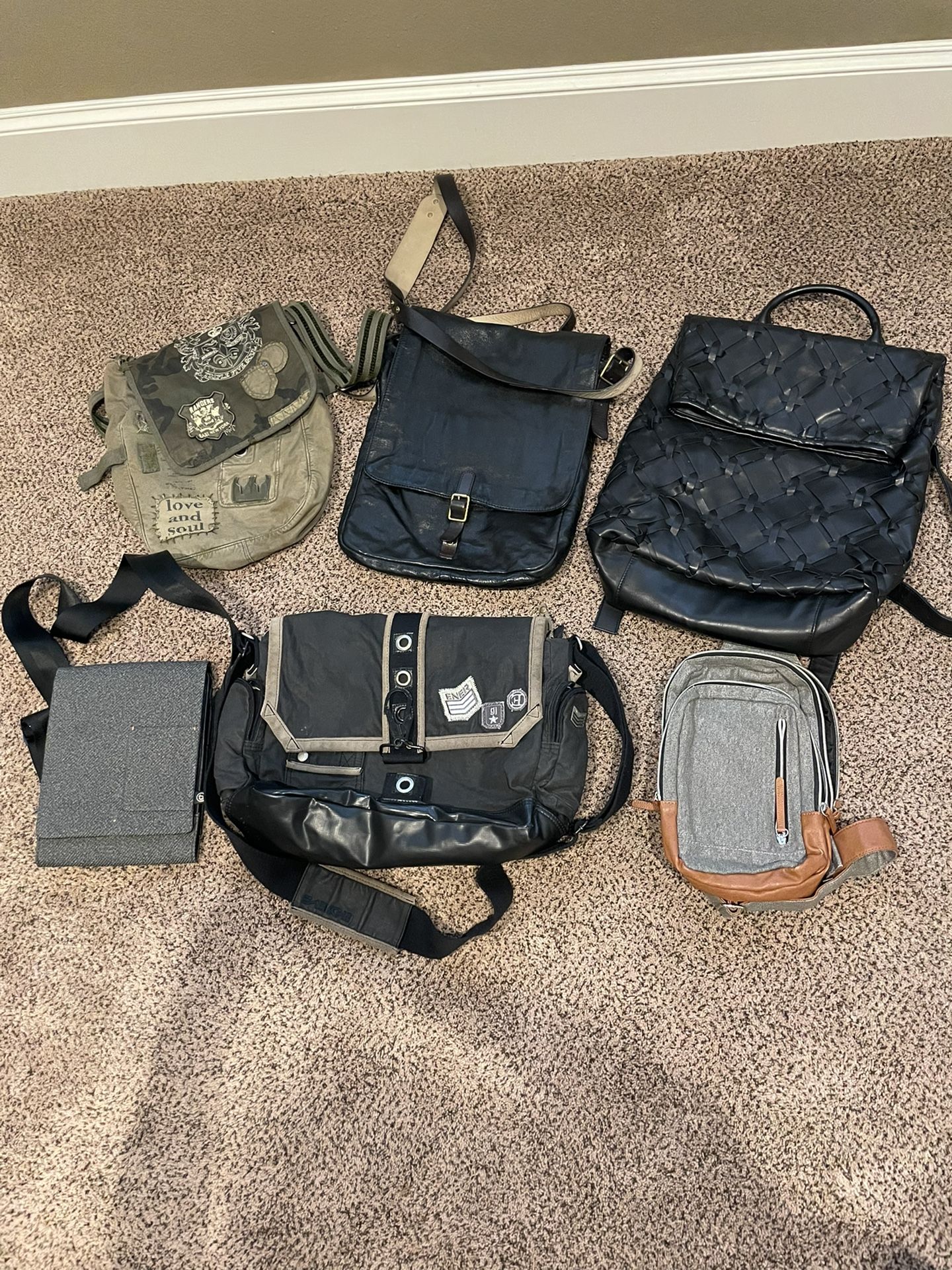Various Mens messenger bags and backpacks. Gently used. $10 each (except Marc Jacobs bag is $15)or $40 for all 6. Pick up in Allen.
