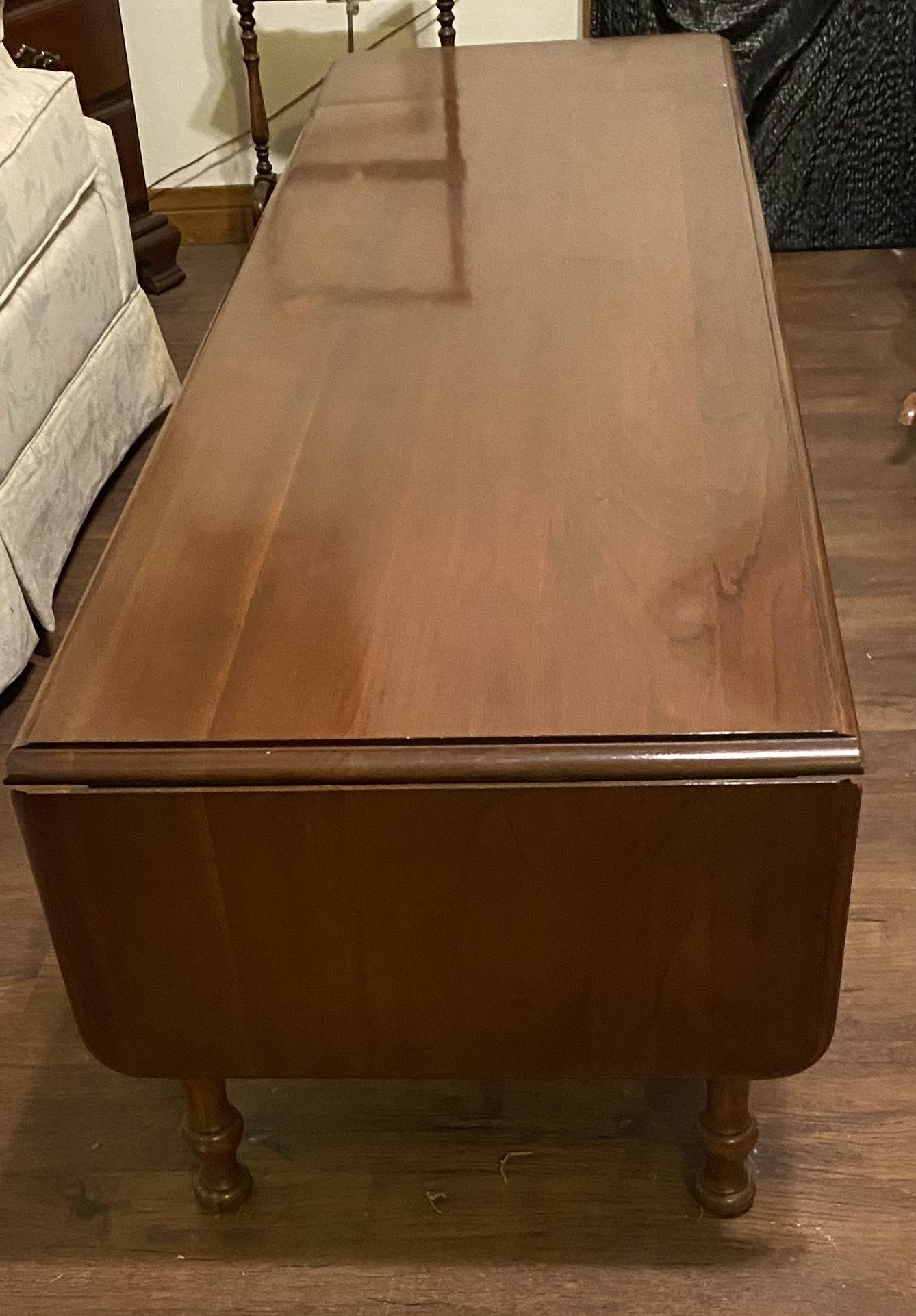 Beautiful, long and lean. solid maple wood with a drop leaf on each end. Great length for long sofas. Traditional style. Must make an appointment by sending a text only to Lynn, 7 days per week from 11:00 A.M.-5:00 P.M. Sorry no deliveries. $150.00 OBO Cash only