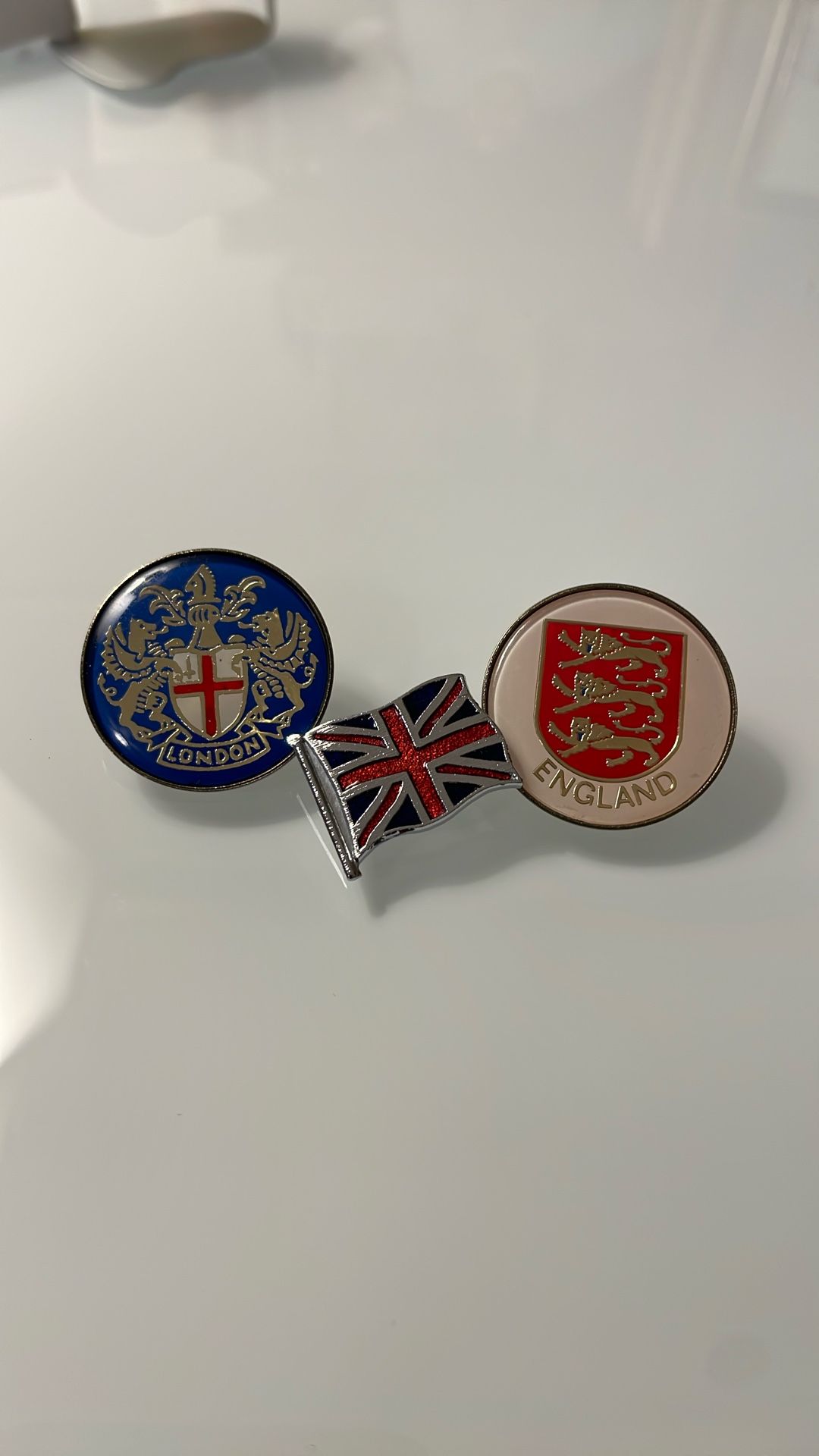 Union Jack, England coat of arms and London coat of arms. 1” diameter.