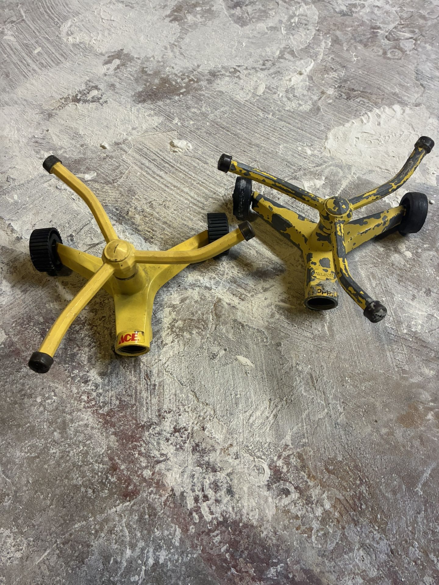 Two outdoor turning spray sprinklers with wheels.