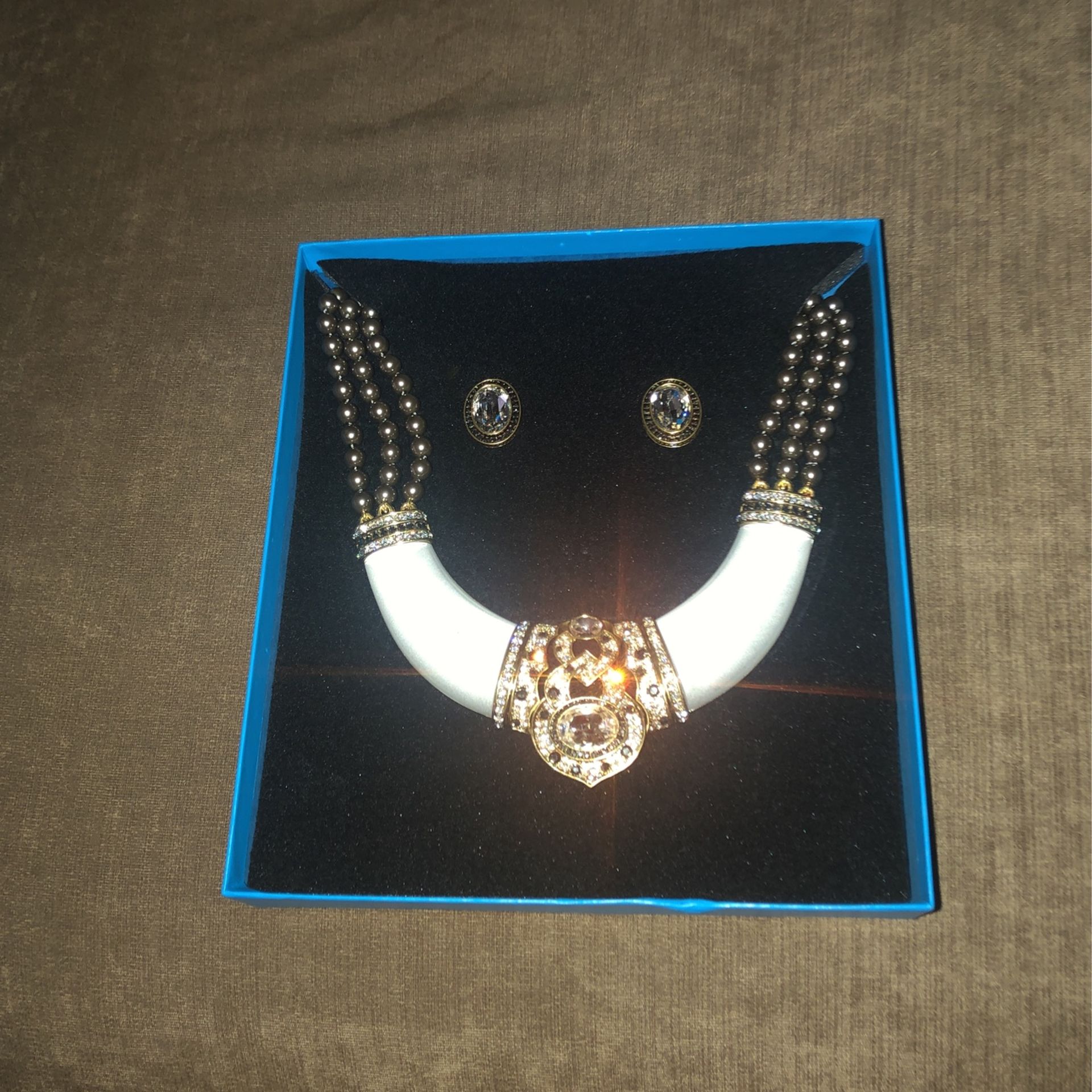 Necklace and earrings dark and light gray in color with white and gray crystals asking 50 will take best offer