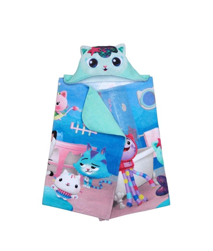 The Gabby's Dollhouse Mercat Kids Cotton The hooded Towel is made of 100% cotton and measures 50 in x 24 in . It features a soft and absorbent design, perfect for keeping kids warm and dry. The towel can be worn as a poncho or bathrobe and has corner pockets for comfort. It is easy to care for, as it can be machine washed and dried without fading Designed for children aged 3-7, this hooded towel is versatile and suitable for home, beach, or pool use, making it a practical and cozy accessory for kids.