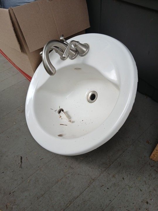 Oval sink, 21" across, 17" deep. No chips or scratches. Finish still good, not worn. Faucet is nickel finish and no wear.