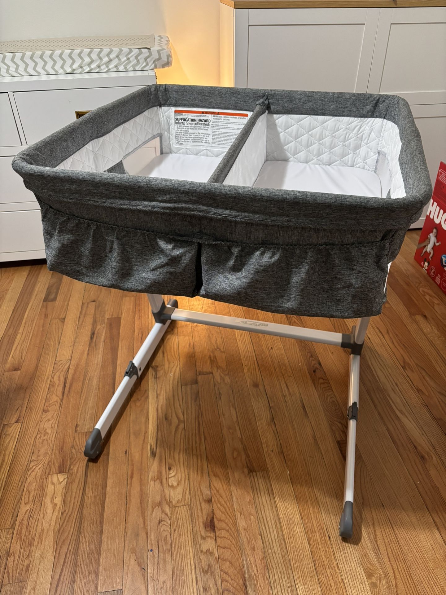 Our twins only used this bassinet for a few months. It’s still in really good condition. Dimensions: Width: 30 inches Length/Depth: 30 inches Height: Adjustable, from ~32.5" (lowest) to ~38.25" (highest)