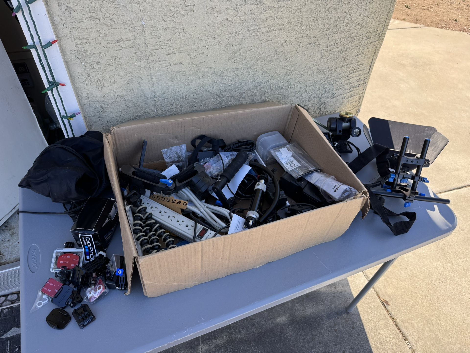 Here is a bunch of camera gear…too much to list. Lots of camera rig equipment, GoPro accessories, tripod heads and more. Only $50 for all of it.