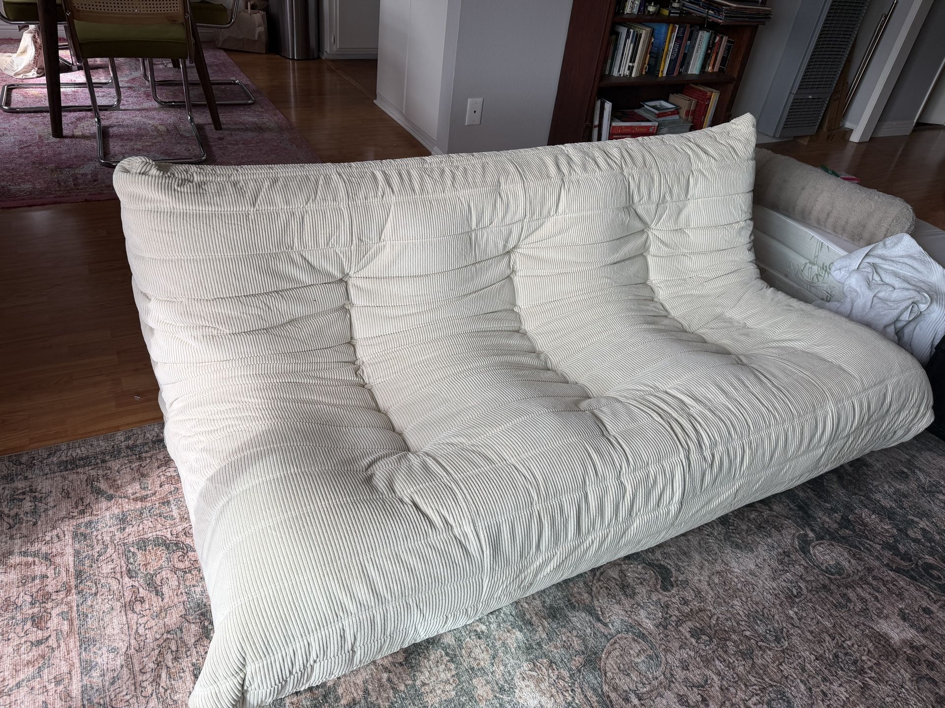 This super cute and comfy floor sofa is for sale! It’s an off white corduroy material that can be exchanged or swapped with other coverings. It’s got great ergonomic shape and super comfy! It’s lightly used I’ve only had it for a year but am moving home to my family’s home and need to sell it. The sofa is 69” long 38” deep 27” tall from floor to top of couch I accept cash, Venmo, or Zelle! PICKUP only. Based in Westchester, LA.