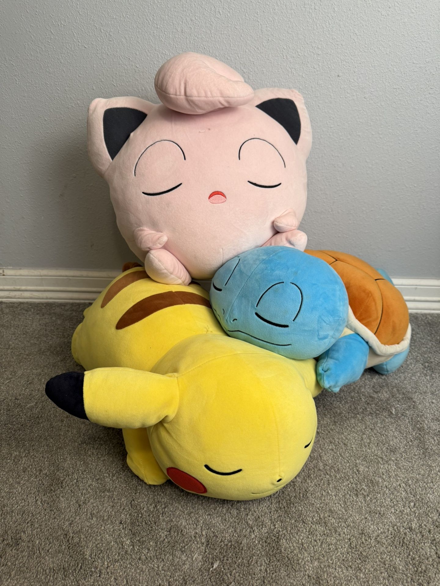 This listing includes three large, super-soft sleeping Pokémon plushies from Jazwares: Jigglypuff, Squirtle, and Pikachu. Perfect for collectors, display, or snuggly décor. Details: • Officially licensed plush • Large, soft, and cuddly • Characters include Jigglypuff, Squirtle & Pikachu • Great for bedrooms, gaming rooms, or gifts Condition: Small dots on Jigglypuff and Pikachu (shown in photos). Squirtle is in great shape. All plush shown are included.