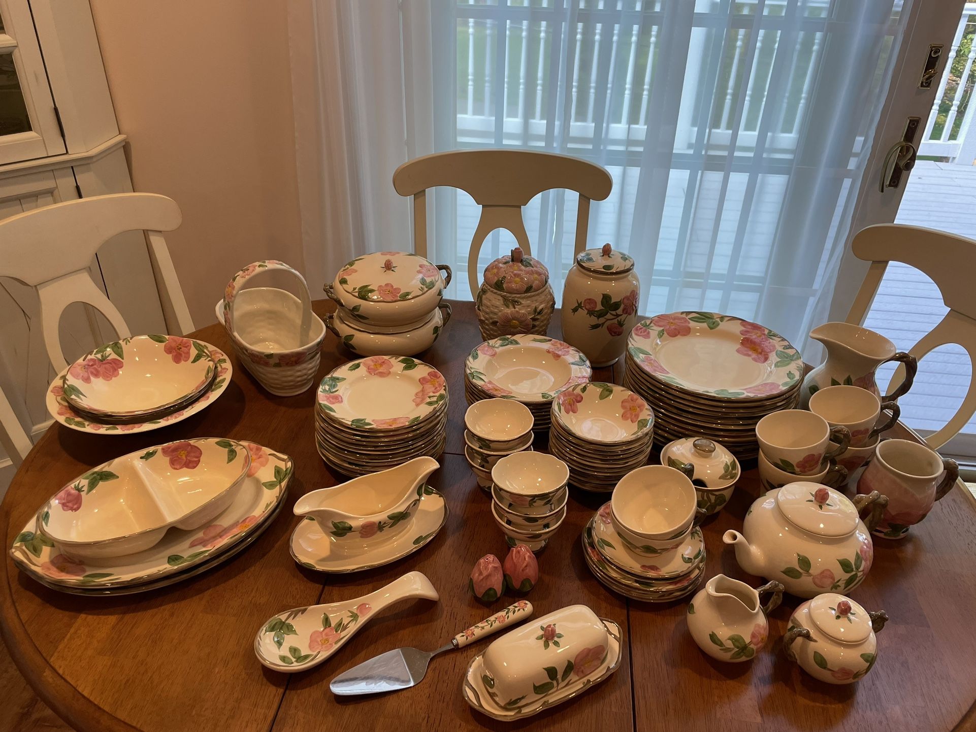 Desert Rose dishes by Franciscan ware. All hand painted in Portugal or England Complete service for 12 Includes all tableware, multiple serving pieces, and decorative pieces. Photo is only 1/3 of complete set. Please email a request for the complete inventory list. Free local delivery. $2000