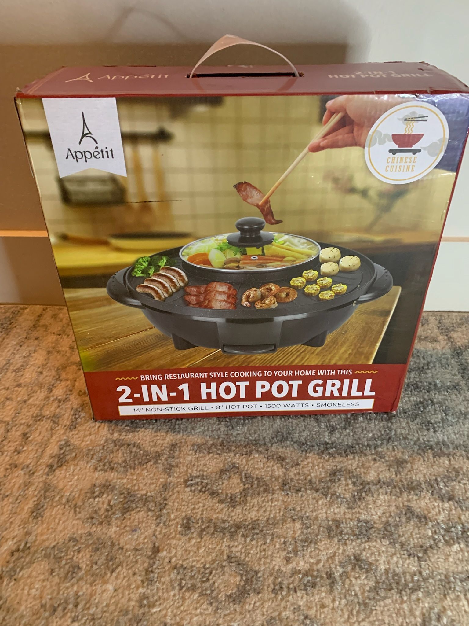 Date night just got better. Grill and hot pot in one — 14” non-stick grill surface surrounds an 8” hot pot for soups or fondue. 1500W, smokeless, slide-out drip tray, and temperature knob. New in box! Retails for $60–70!