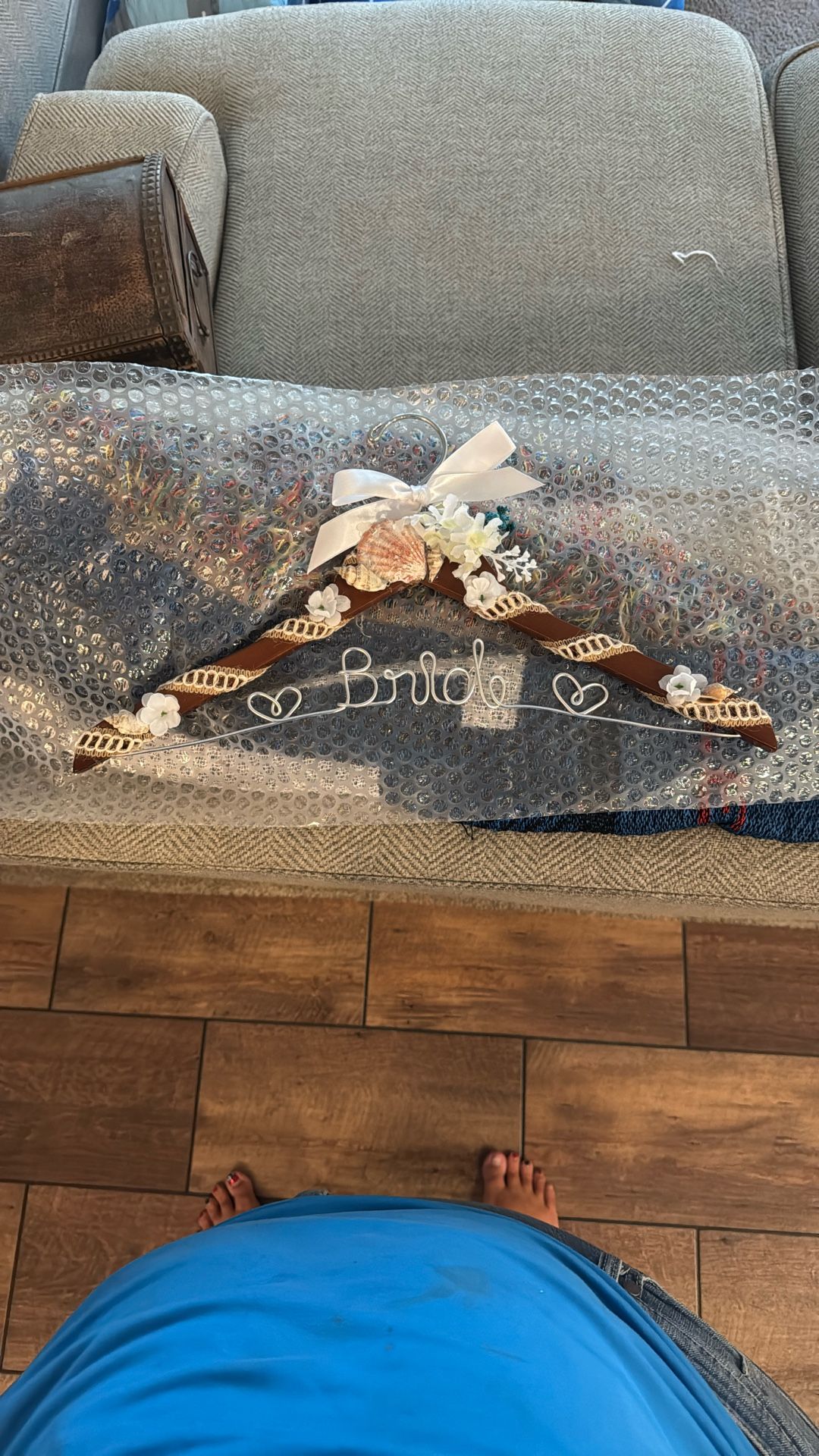 Hanger for wedding dress, matching robes etc. flowers, shells, and ribbon accents.