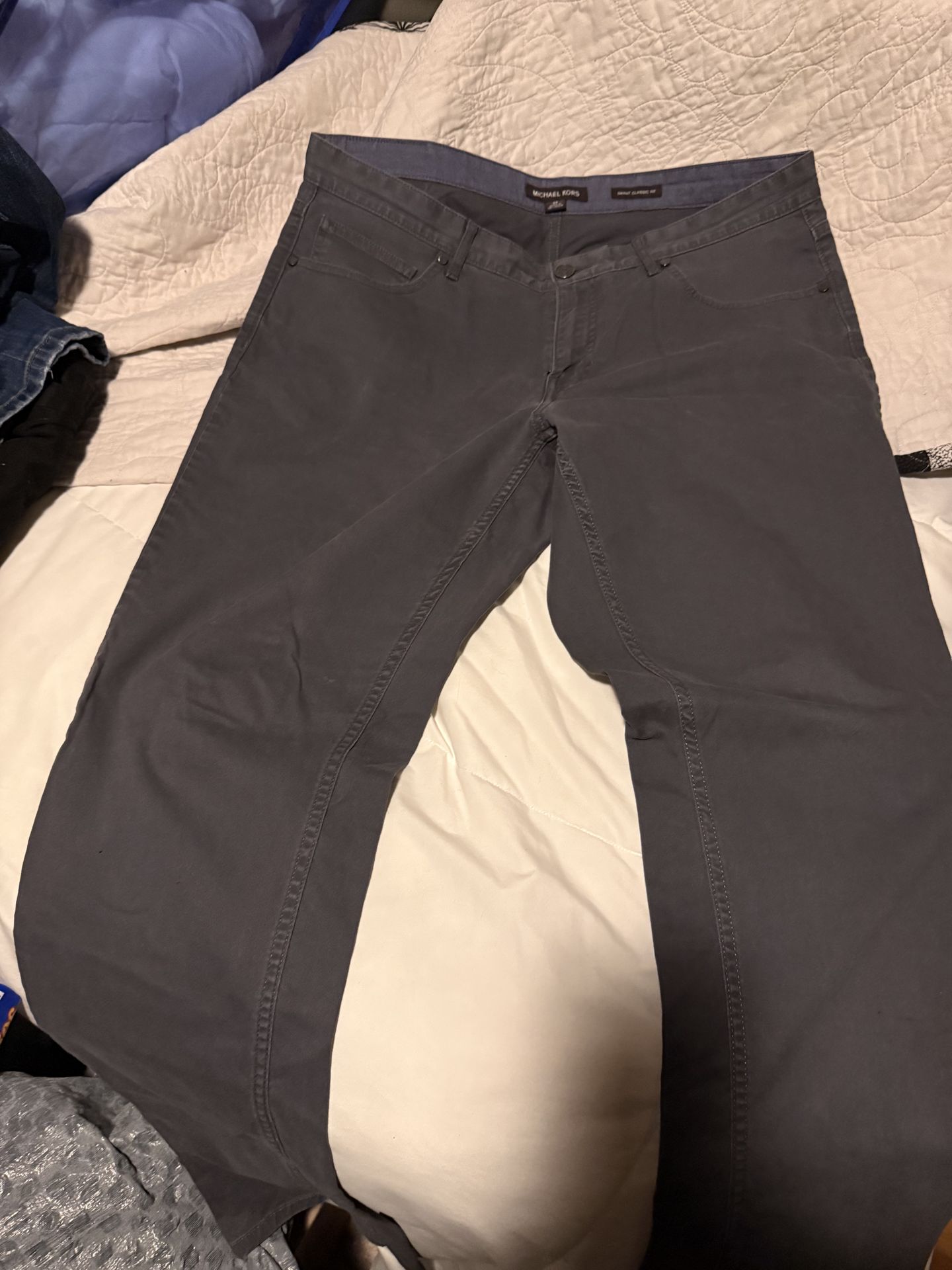 Michael Kors Grant Classic Fit jeans in gray offer a versatile, straight-leg style for men, typically crafted from a comfortable cotton-blend stretch denim. Light, if any wear. Size 34 x 30