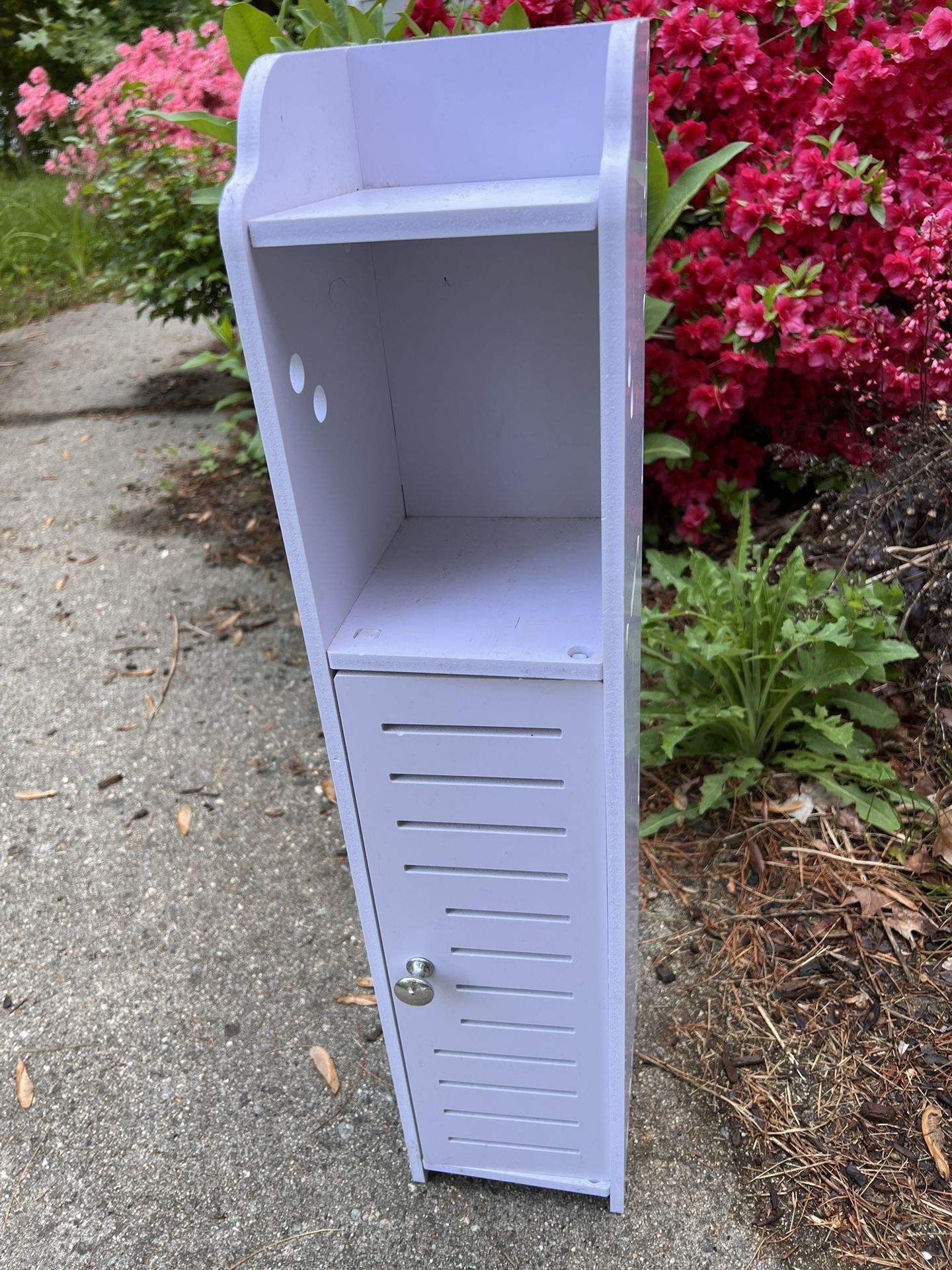 Small bathroom storage cabinet for small space. It is great for a small space when you need some extra storage. Fit great in powder room next to the pedestal sink. Used.