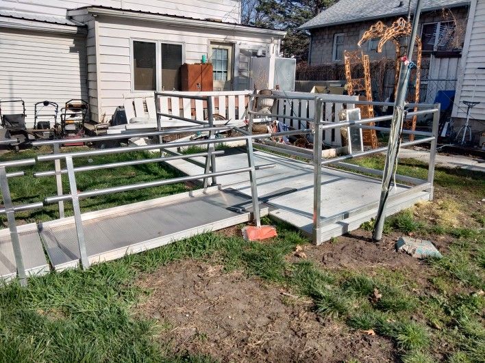 Ez access aluminum light weight, easy setup, wheelchair ramps in good condition. I just quickly stood it up to kinda get an idea of condition, that's why it's not put together. All pieces are there. 2 square 48x48 panels 2 6 foot panels All rails included. Sorry no holds, first come first serve. 2500 Cash Serious inquiries please 515 2 0 6 - 5 0 6 9