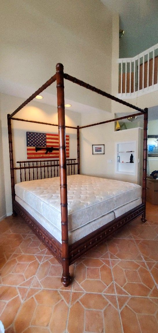 King canopy bed frame Box springs Mattress Custom hand made - no name stamped anywhere Very sturdy and solid