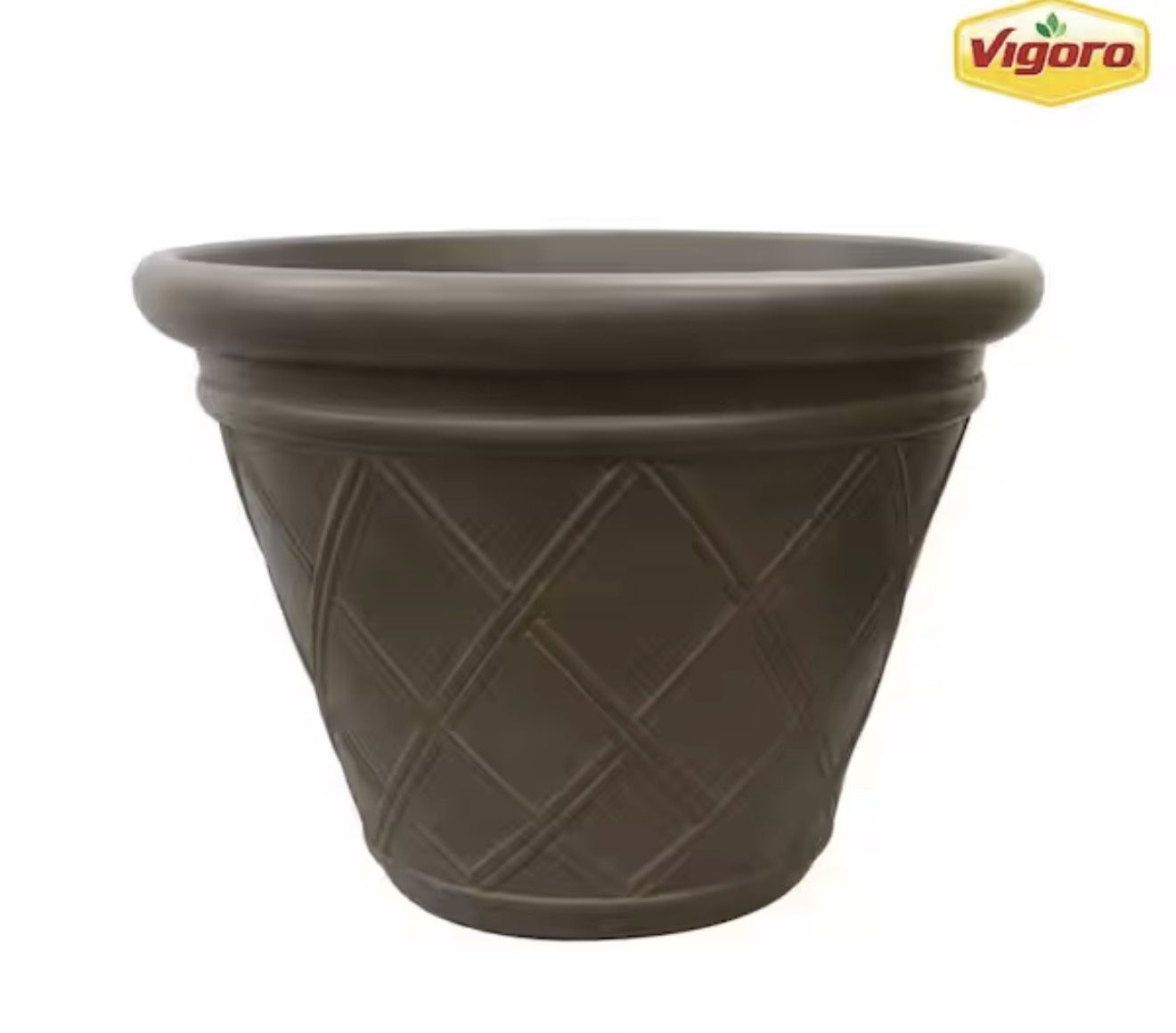 Brand new not used I have 6 of them if buy all i will do $75 for all Vigoro 17.5 in. Lincoln Weave Large Brown High-Density Resin Planter (17.5 in. D x 13.3 in. H) With Drainage Hole Lightweight and easy to move Perfect, large planter for beautiful floral arrangements UV coating that provides a weather-resistant, long-lasting color Includes a drainage hole Dimensions: 17.50 in. L x 17.50 in. W x 13.30 in. H