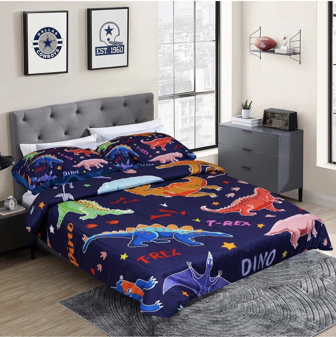 Brand new never used! About this item 1.Vibrant dinosaur design: This dark blue cartoon dinosaur patterned comforter set features eye-catching and lively dinosaur illustrations that are perfect for boys. The playful and adventurous theme adds excitement to their room. 2. 3Pcs dinosaur comforter set for kids: The twin size dinosaur bedding set include 1 68''*85'' comforter and 1 20''*30''pillowcases.The full size dinosaur comforter set include 79''*89'' and 1 20''*30''pillowcases. 3.Versatile for all seasons: The soft and breathable fabric make this bedding set suitable for year-round use. It provides warmth during colder months and breathability for a cool and comfortable sleep during warmer seasons. 4.Durable and easy to maintain: All edges of the dinosaur comforter set are finely stitched and sewn, ensuring that the comforter remains intact even after multiple washes, allowing for long-term https://offerup.com/redirect/?o=dXNlLkl0 is easy to care for and can be machine washed, ensuring convenience for busy parents. 5.Perfect for boys of all ages: Whether it's a toddler, young boy, or teenager, this dark blue cartoon dinosaur bedding set is a great choice. Its timeless design appeals to boys of different ages, making it a versatile and long-lasting addition to their bedroom.