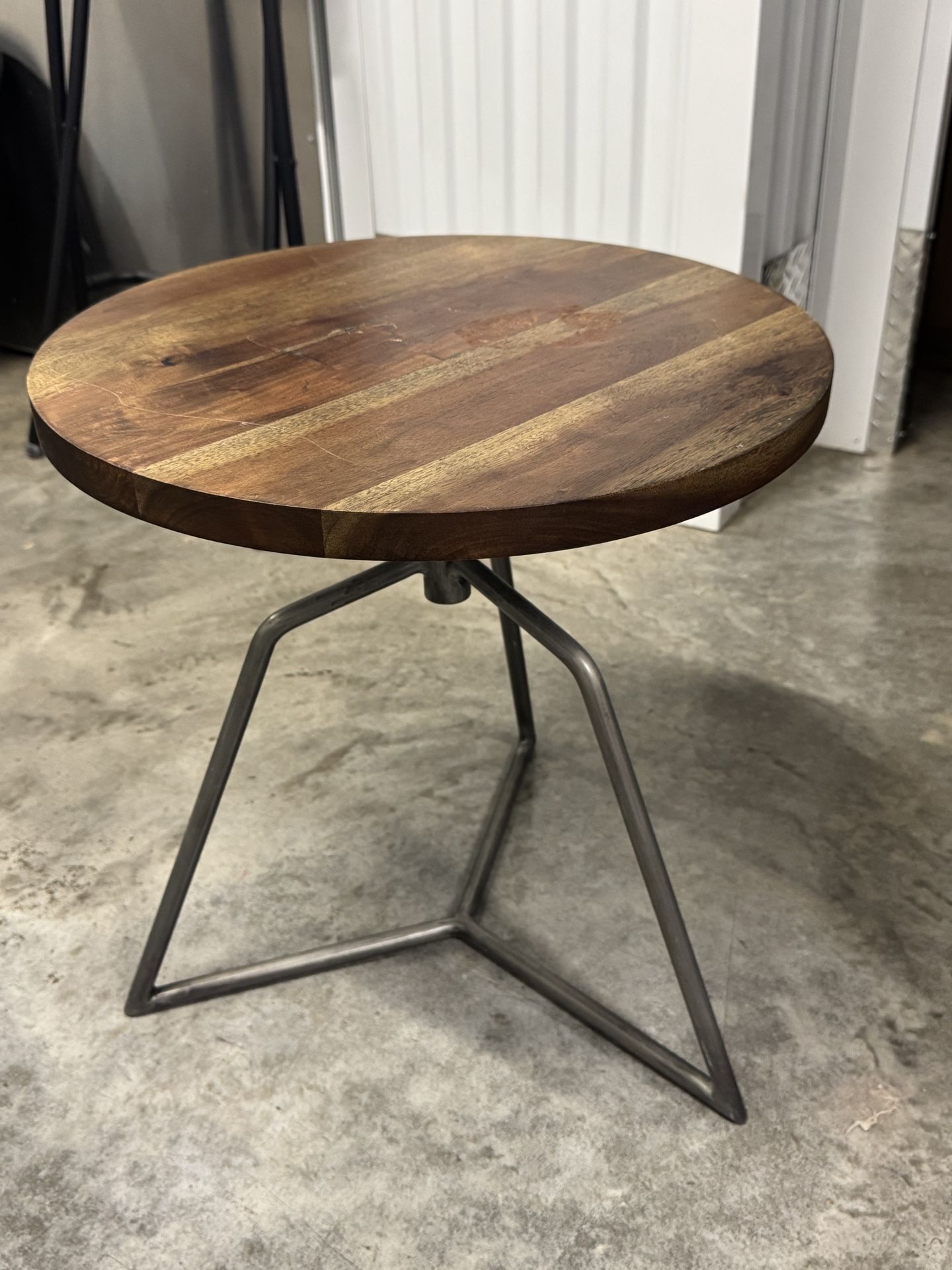 Round side table with a solid wood top and sturdy metal frame- perfect as a side table, nightstand, or plant stand. Modern-industrial design.