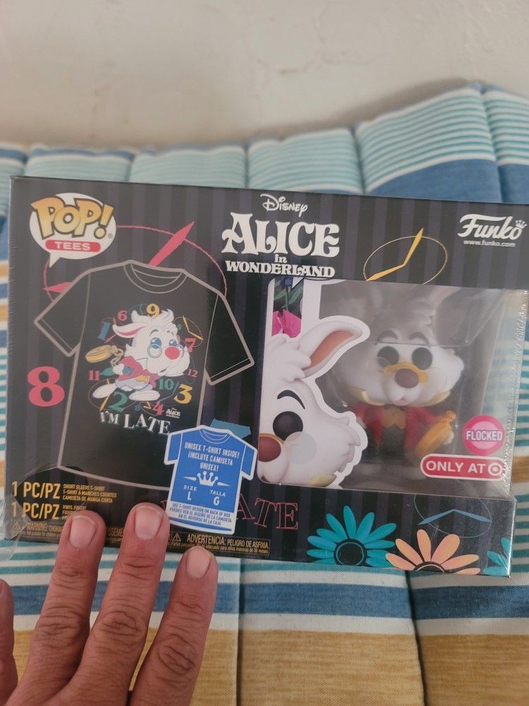 White Rabbit/ flocked with size Large Tshirt. Funko pop sealed never opened