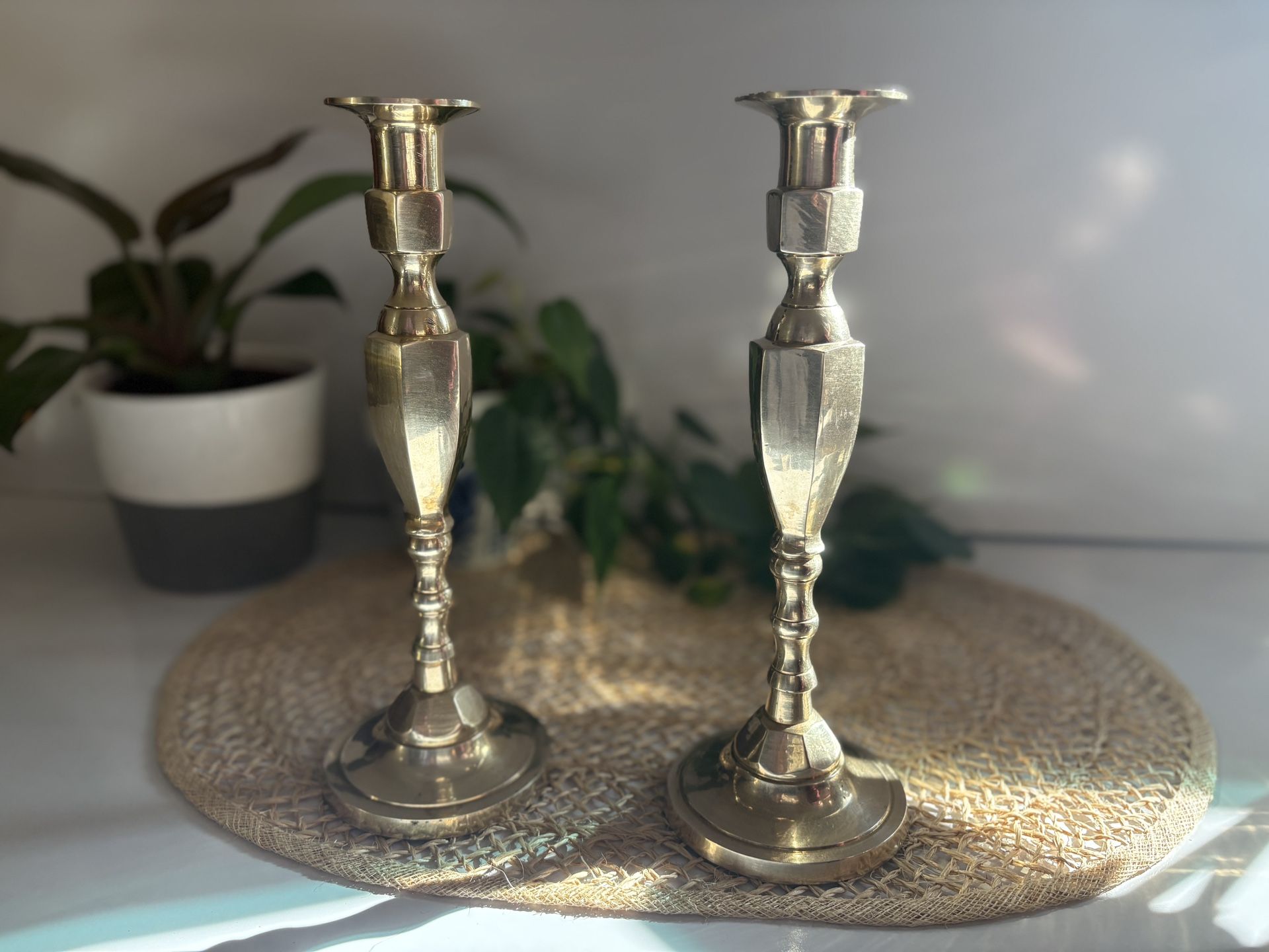 2 Tall Vintage Brass Candlesticks Set Matching Pair Gold Metal Candle Holder