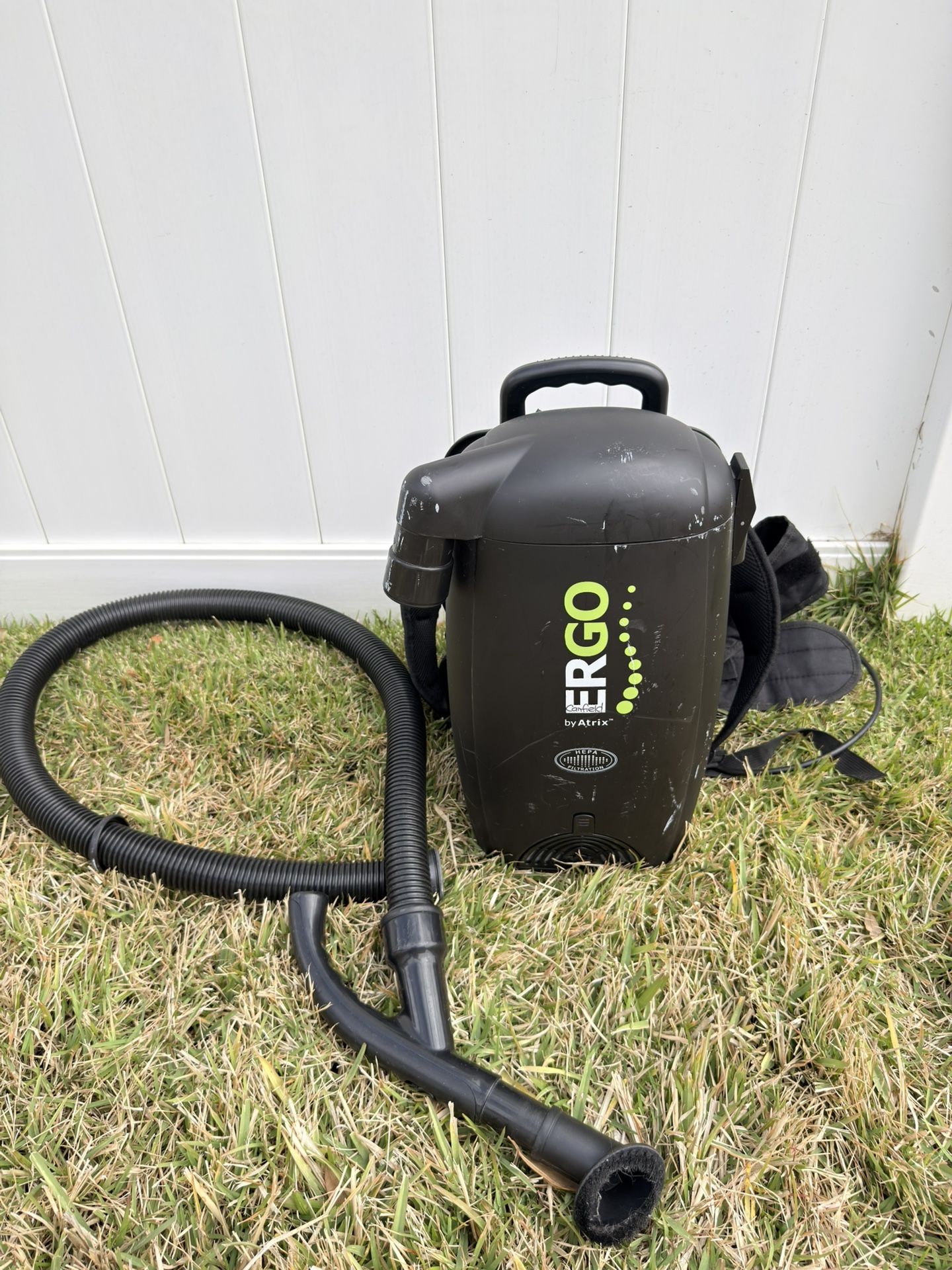Atrix ERGO Backpack Vacuum for sale. Backpack-style vacuum cleaner. Uses HEPA filtration technology, highly efficient at capturing fine particles and allergens. Pickup in Winter Garden.