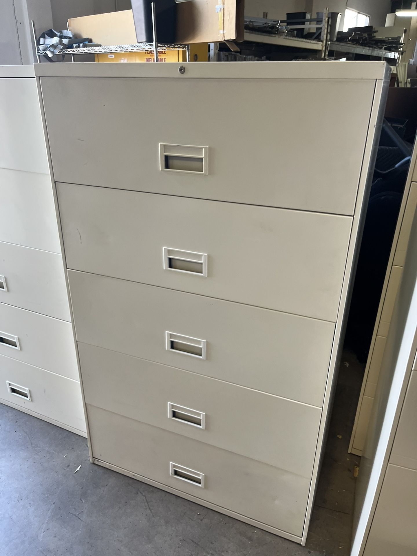 This is an off white lateral filing cabinet with five drawers. Key is not included.
