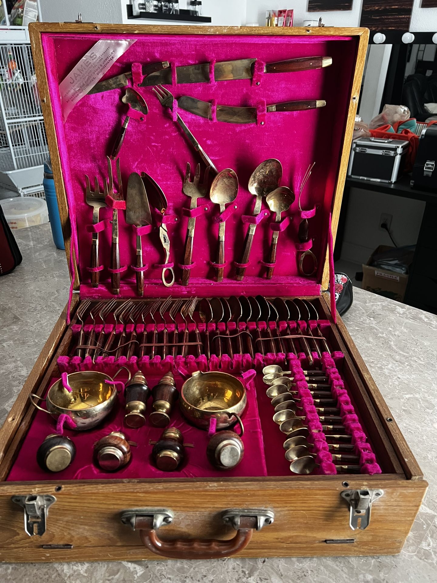 I have a Vintage mid century 152 complete piece bronze and rosewood James Cutlery silverware set with box asking $400 obo great addition to any collection!
