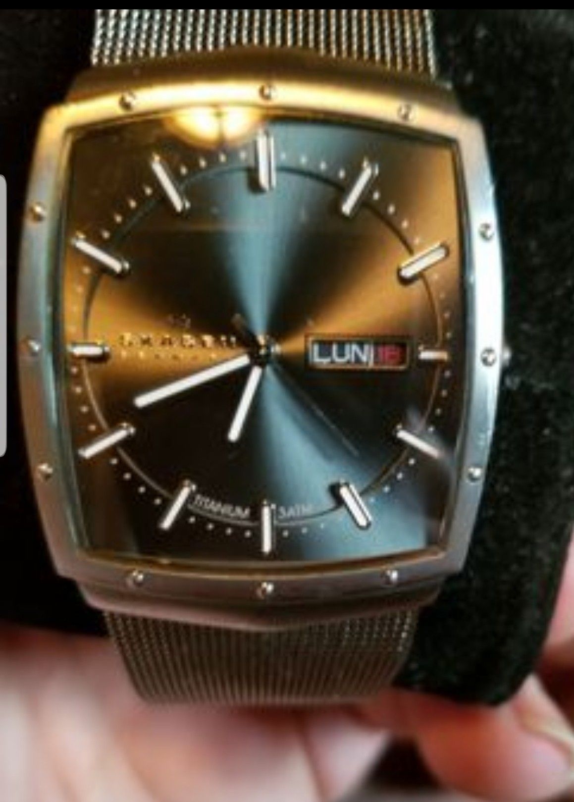 Skagen Titanium Slimline men's Date and Time watch #396lttm.... Good condition except for Some very light scratches on the clasp and back cover. All functions work. New battery. Very light weight and thin.