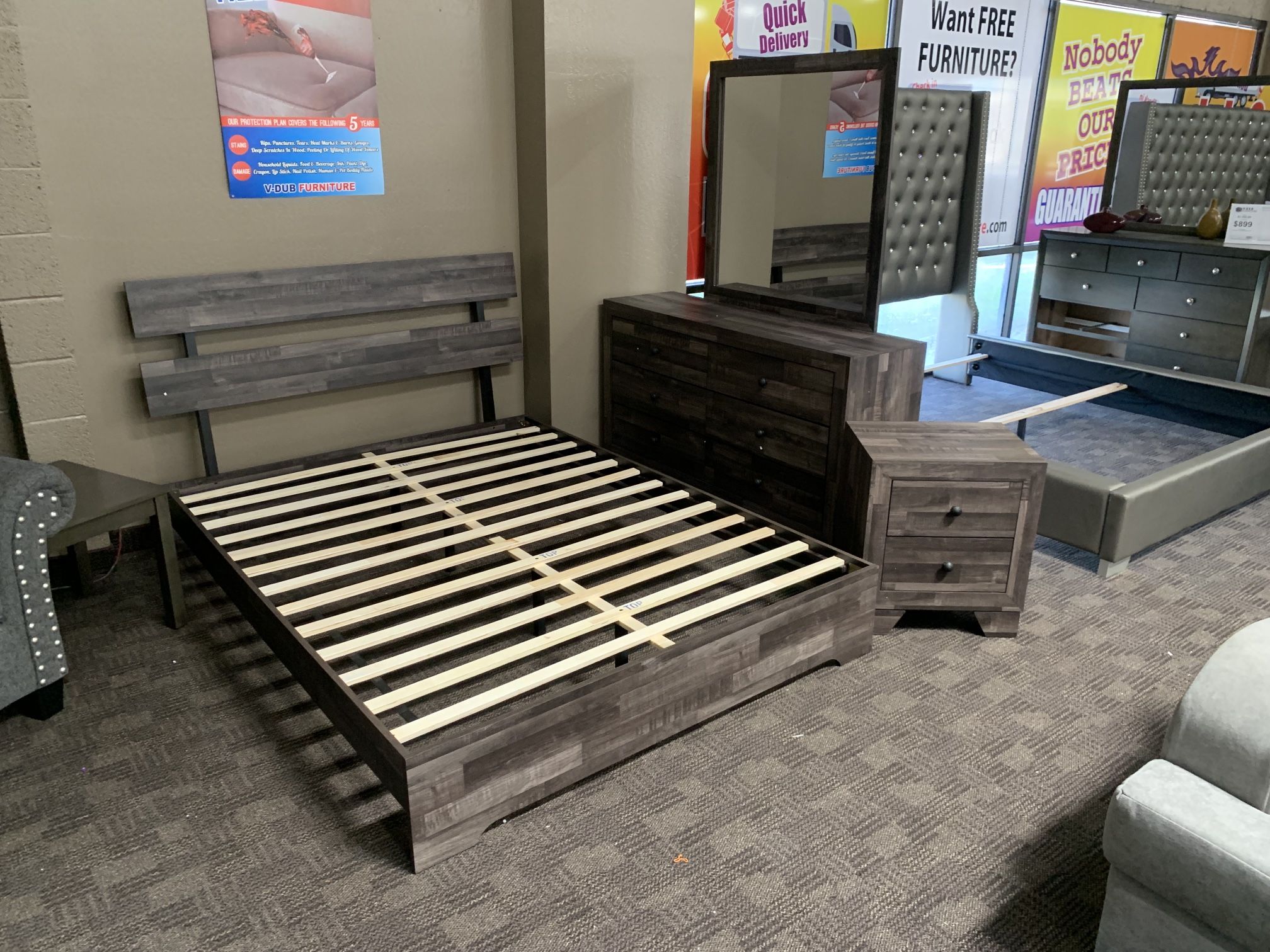 Brand new queen bedroom set. Includes Queen platform bed frame, dresser, mirror and nightstand. All brand new in box. Delivery and payment plans available