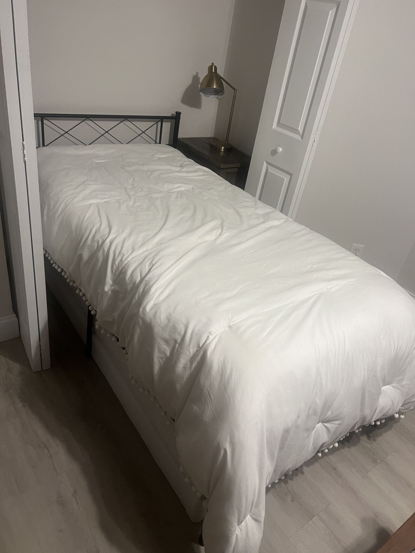 Very lightly used (only a few times for a visiting family member) moved and dont have room for. Spring Mattress is in great condition. I can not bring to you. Not heavy. Bought for a total of $240. Asking $100 for all. Includes box spring cover (box spring is lightweight metal).
