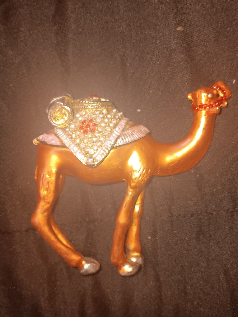 Camel trinket box. Metal, enameled and jeweled. Hinged lid.