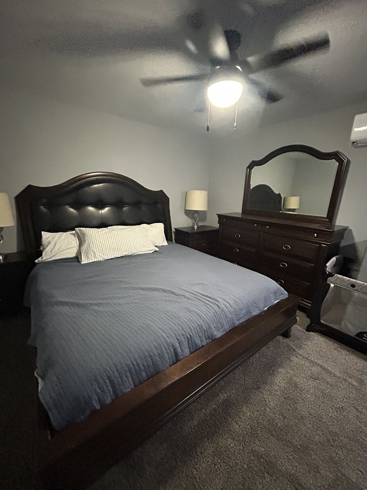 Dark cherry wood. Leather headboard. 2 matching nightstands with lamps. Dresser and mirror. Mattress optional.